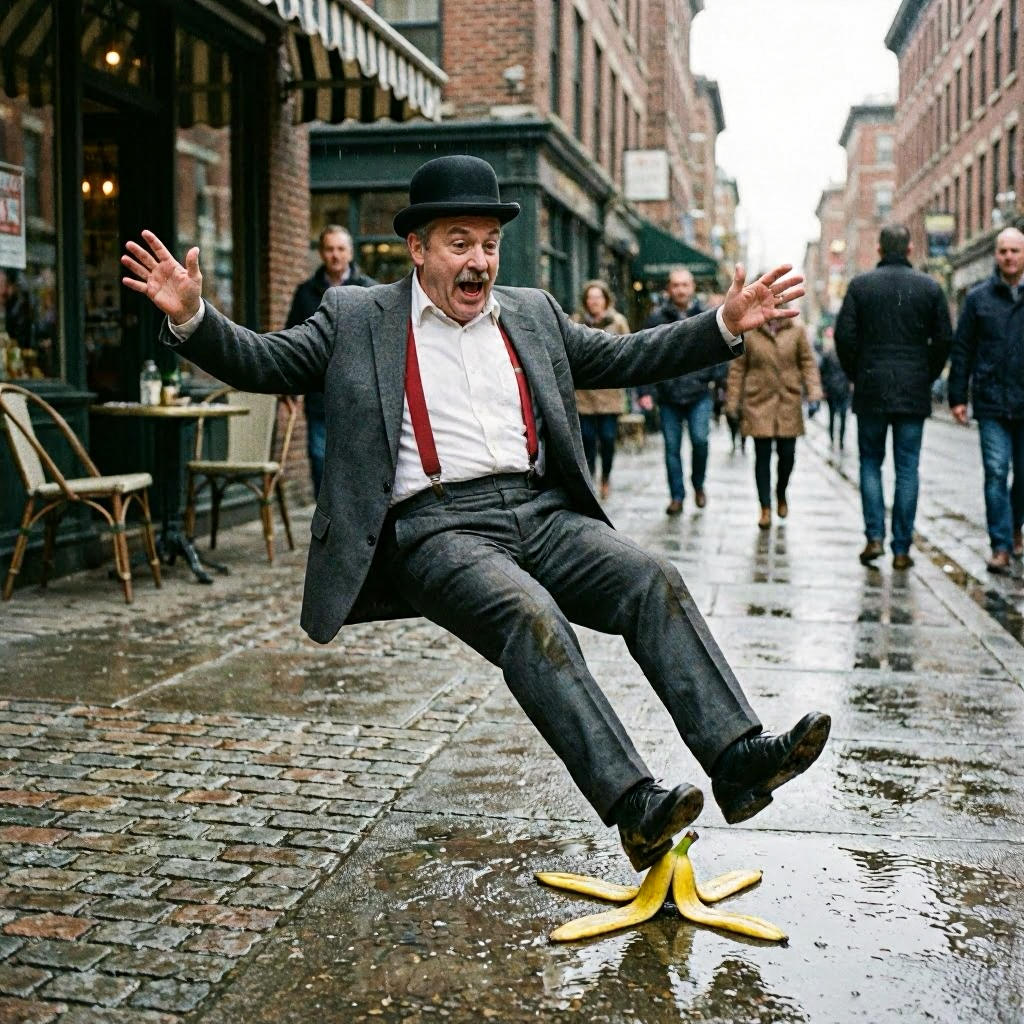 The pinnacle of comedic pratfalls used to be the person slipping on a banana peel. During the Silent Film era, Charlie Chaplin, Harold Lloyd, and Buster Keaton performed the falls while live orchestras in the theater provided appropriate sound effects. As films added sound, we were introduced to The Three Stooges. Slapstick comedy never stopped with this trio and they perfected the slip-and-fall technique using any prop available, including the banana. In the modern era, most slips on a banana peel were probably portrayed from the cartoon perspective with animation that made the slipping and falling even more dramatic.
