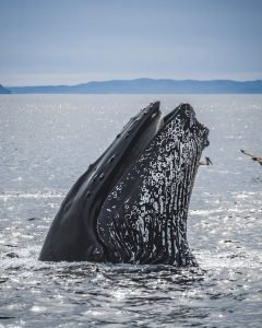 Humpbacks grow between 46-56 feet in length and weigh nearly 44 tons. The males are the singers, creating songs that can last over half an hour. Their diet consists of krill and other small fish. These whales are “gulp-feeders,” creating a network of bubbles to capture their prey before charging at them with their mouths wide open.
