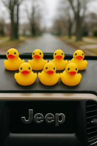 It is not unusual for Jeep owners to find a new rubber duck waiting on their vehicles. Typically, a kind note is to be written on the rubber duck. The Jeep owner adds the new duck to the “duck pond” – the row of ducks lined up across the dashboard.